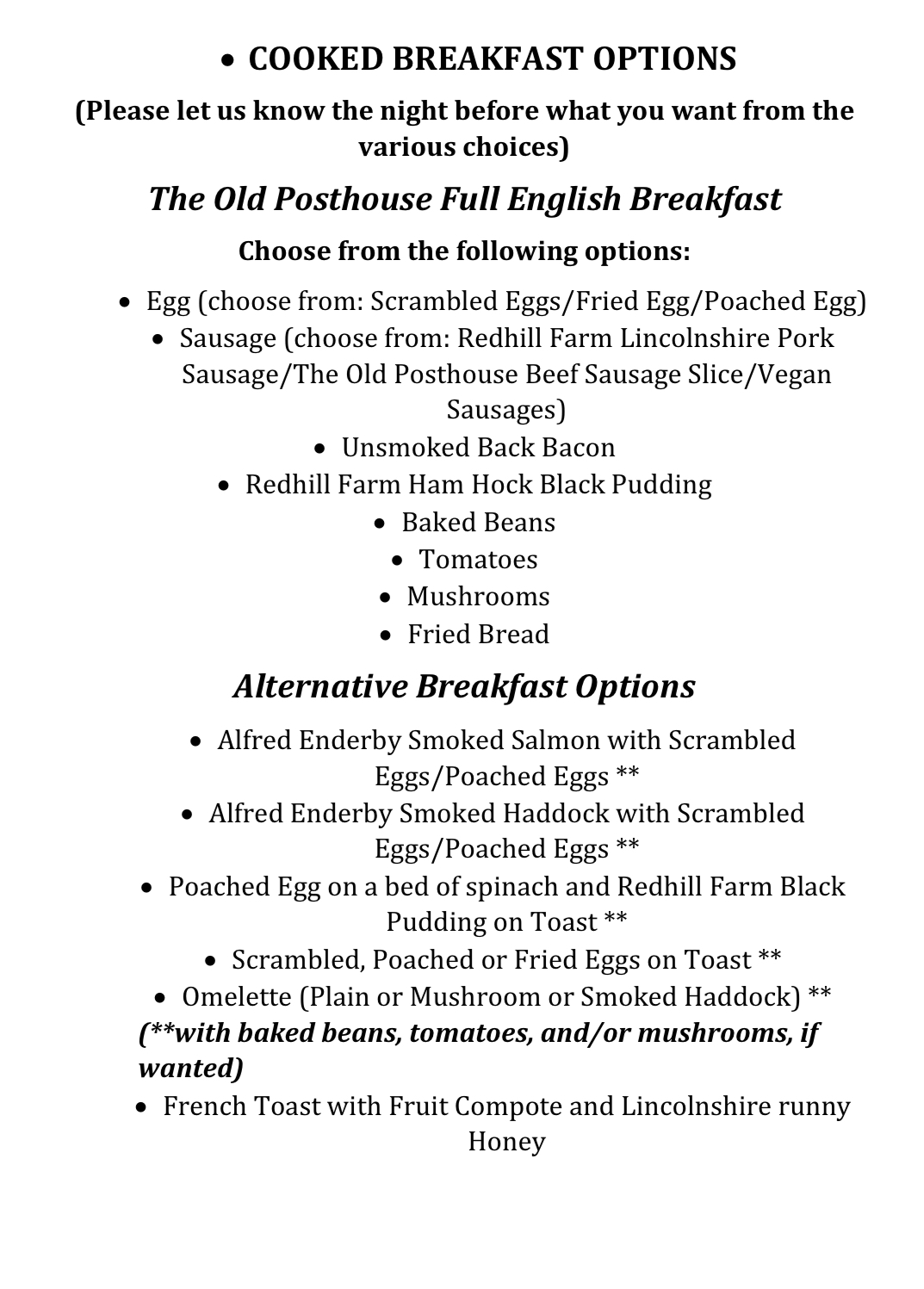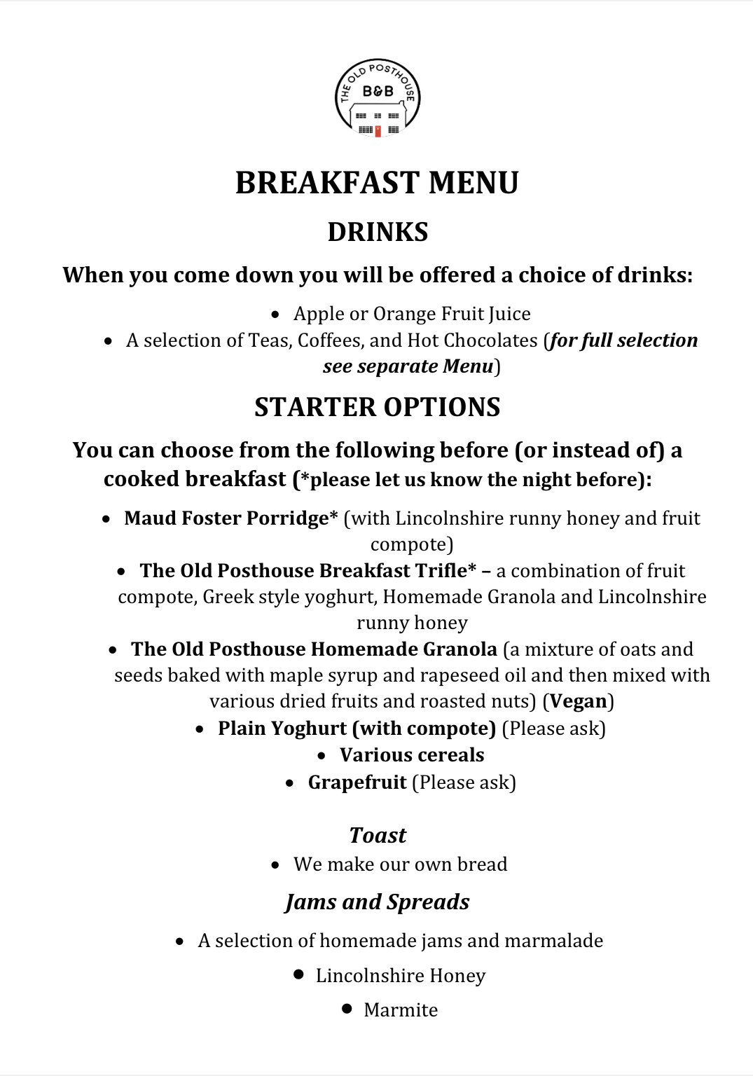 A number of our guests decide to stay with us because they like the sound of what we offer for breakfast and because of the reviews we get for our breakfasts. https://theoldposthousebnb.co.uk/latest-news/post/breakfast-reviews